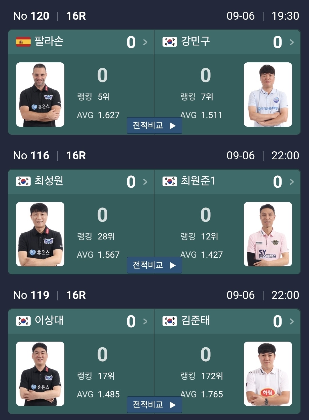 한편 16강에 올라온 선수들은 어느 당구팀 소속일까요? 매시즌 팀리그 멤버는 달라질 수 있습니다.