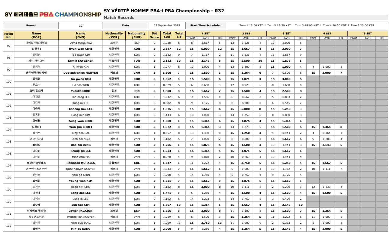 1. SY 베리테옴므 PBA 챔피언십 32강 경기결과