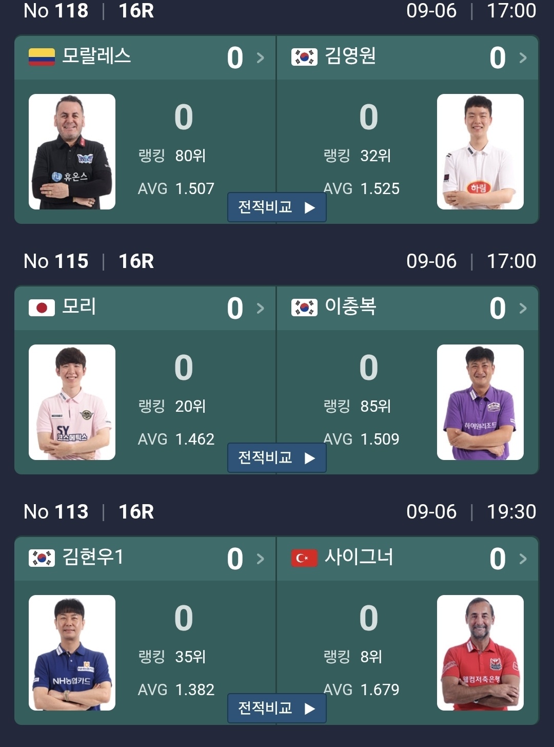 최성원 최원준, 이상대 김준태, 모랄레스 김영원의 매치에 주목이 됩니다. 이번대회에서 또 새로운 PBA 챔피언이 탄생할 수 있을까요? 이상대, 이충복이 강력한 후보입니다.