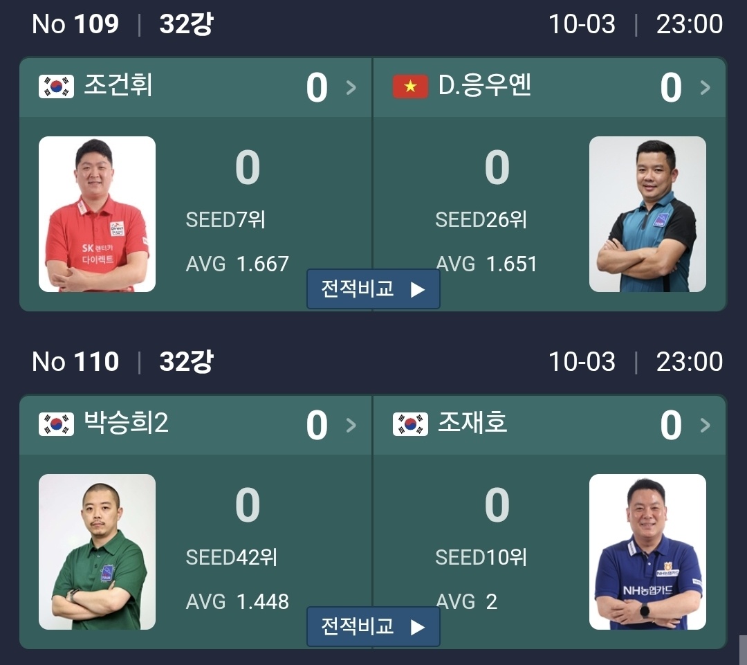 한편 강동궁은 고상운과 조재호는 박승희 선수와 32강 경기를 펼칩니다.