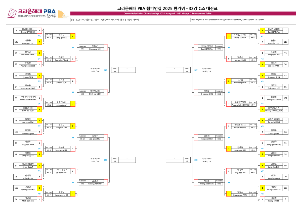 그럼 지금부터 크라운해태 PBA 챔피언십 2025 한가위 32강 대진표를 보기에 앞서 64강 경기결과를 먼저 살펴보겠습니다.