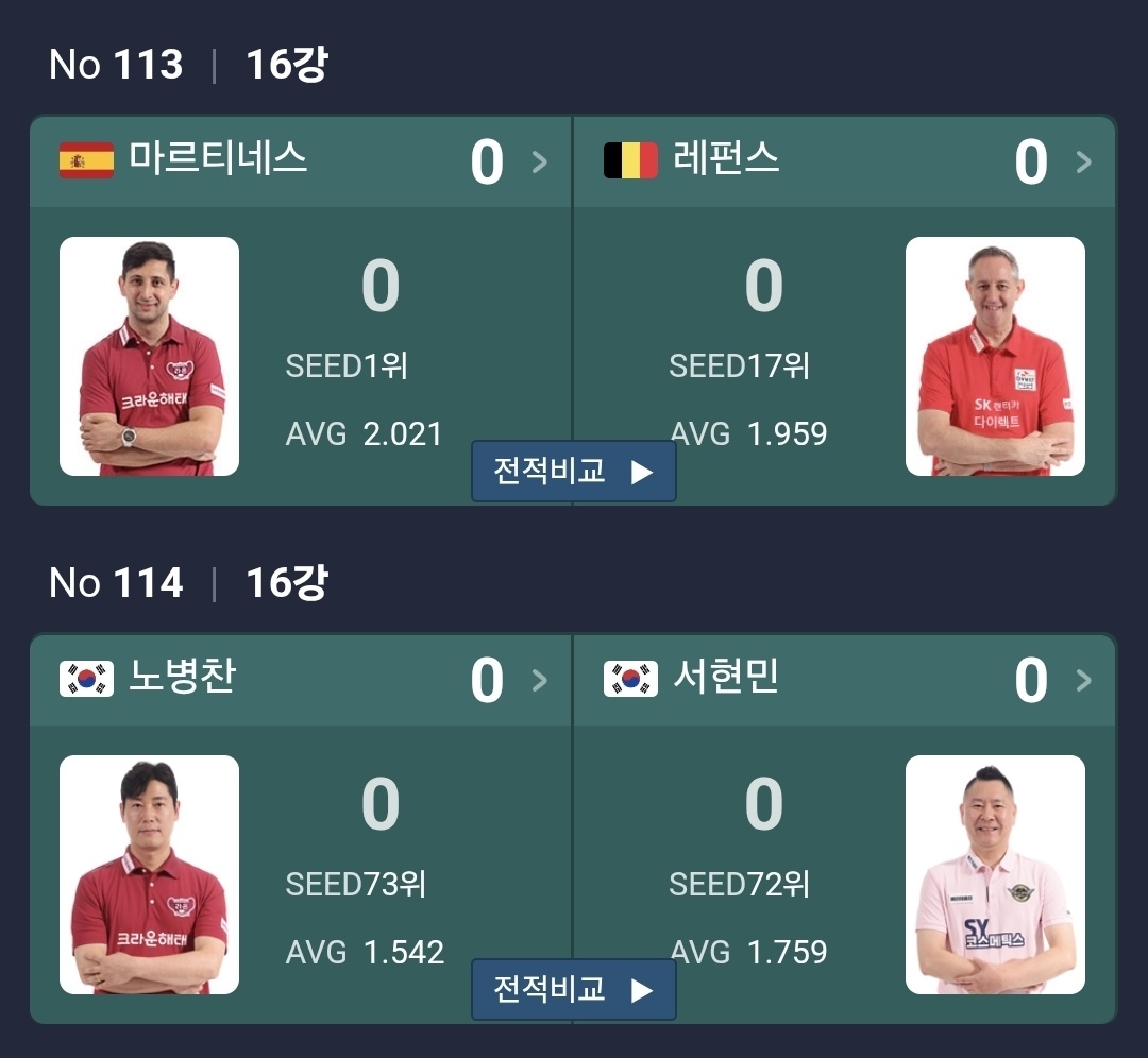 한국 선수 가운데 pba 쳄피언 출신은 서현민, 강민구, 조건휘, 조재호 이렇게 4명입니다. 우선 다비드 마르티네스는 로에디 레펀스와 16강 경기를 펼칩니다. 노병찬 선수는 서혀민과 16강 경기를 펼칩니다.