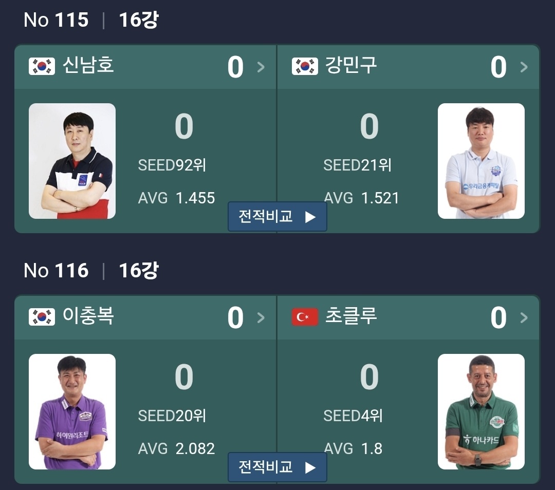 신남호는 강민구와 이충복은 튀르키예 3쿠션 당구전사, 초클루와 16강 경기를 예약하고 있습니다. 이번에 새로운 면모를 보여주고 있는 고경남은 응오딘나이와 16강 경기를 펼칩니다.