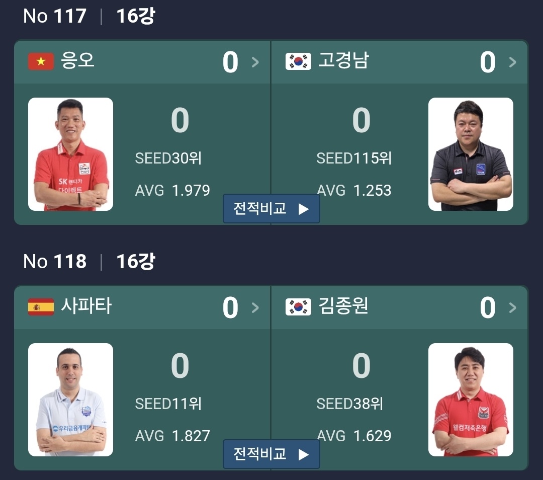 김임권, 고상운, 노병찬, 고경남, 신남호, 이충복, 김종원 선수 더 분발해서 상금이 더 많은 다음 라운드로 진출하면 좋겠습니다. 일단 4강 준결승에 진출을해야 상금 1천만원을 확보하게 됩니다.