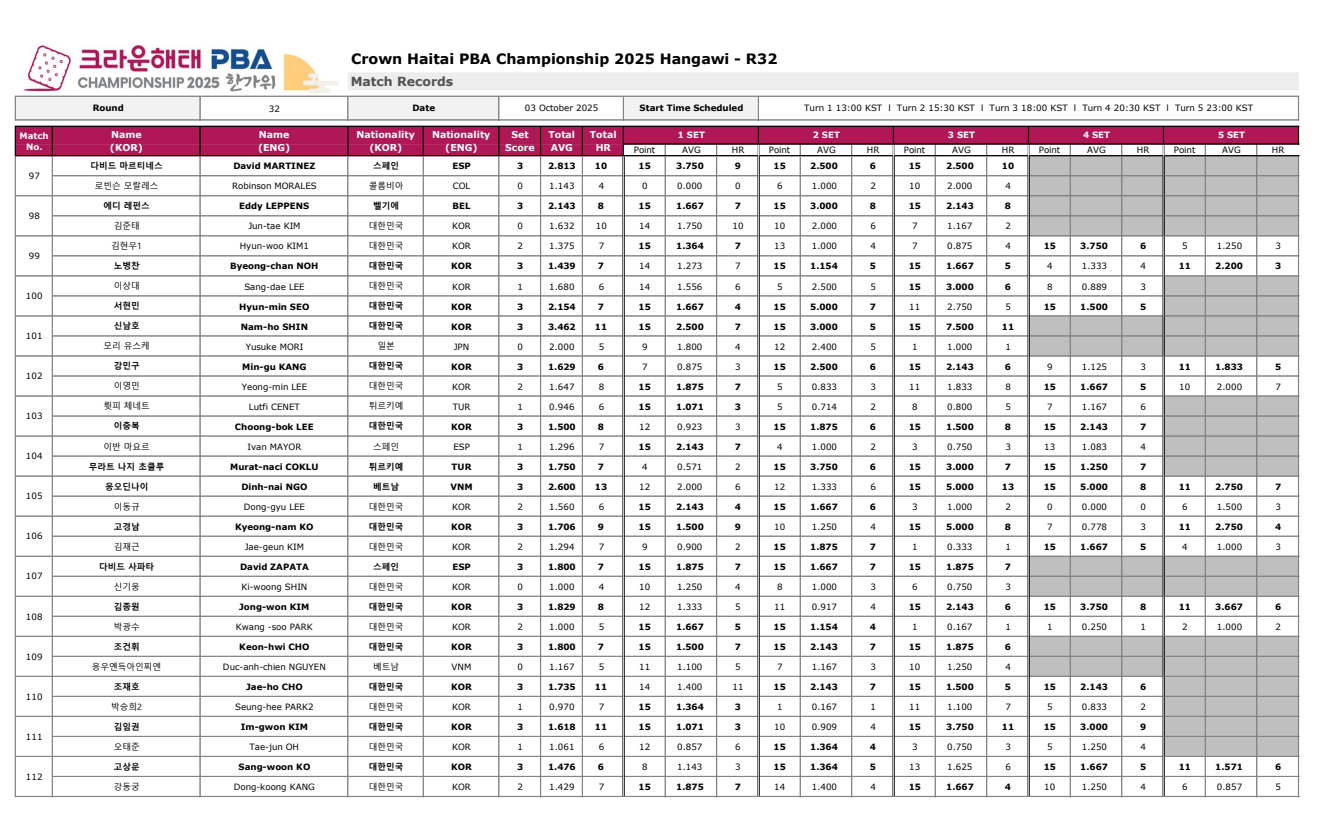 크라운해태 PBA 챔피언십 2025 한가위 32강 1일차 주요 경기결과 입니다. 다비드 마르티네스는 다비드 사파타와 함께 스페인 당구선수 대표주자로 32강에 진출하였습다.