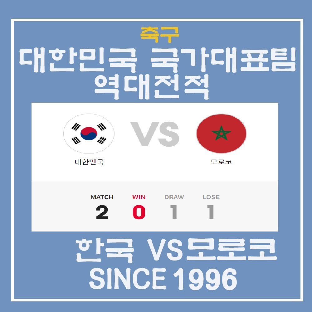 오늘은 한국 모로코 축구 역대전적 경기결과 (남자축구 국가대표팀 출전 선수명단)에 대한 정리하였습니다. 대한민국 VS 모로코 남자 국가대표팀 역대 전적 경기결과는 2전 1무 1패입니다.