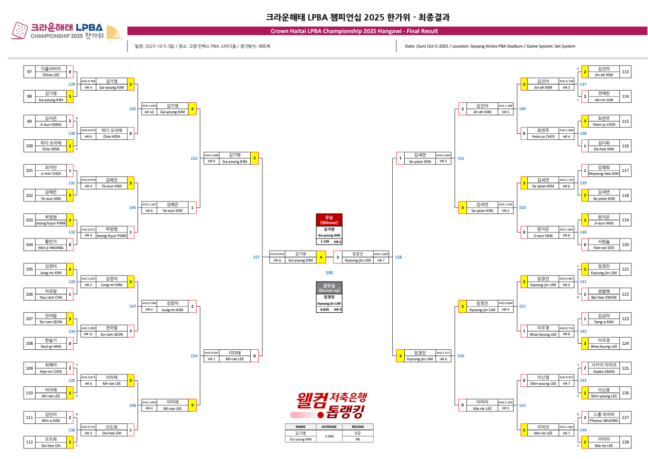| 크라운해태 LPBA 챔피언십 2025 한가위 결승 대진표 - 김가영 vs 임경진 (0) | 2025.10.04 |