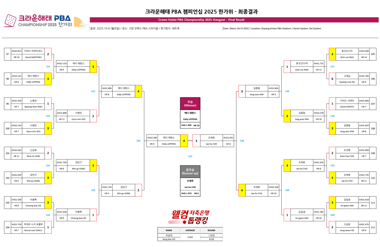 | 크라운해태 PBA 챔피언십 2025 한가위 결승 대진표 - 조재호 vs 에디 레펜스 (0) | 2025.10.06 |