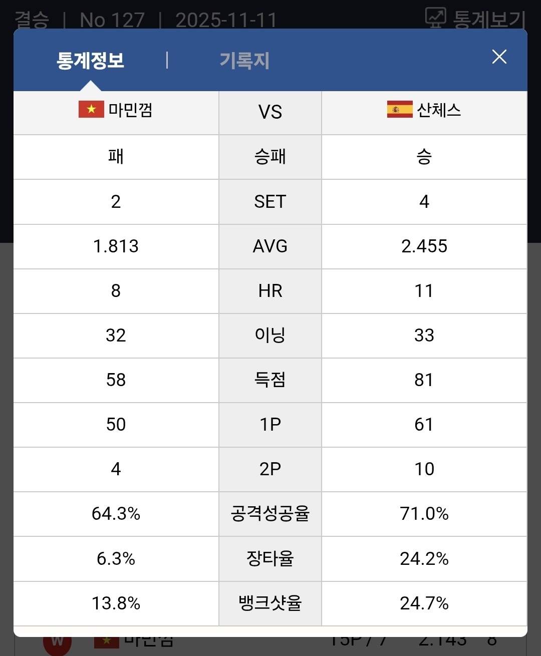 결승전 전 구간에서 산체스의 장점은 명확했습니다. 평균 득점 2.455는 결승 무대의 압박을 감안할 때도 매우 높은 효율이며, 하이런 11점은 분위기를 단번에 바꾸는 결정타였습니다. 공격 성공률에서도 산체스가 앞서며 시도 대비 효율을 끝까지 유지했습니다.