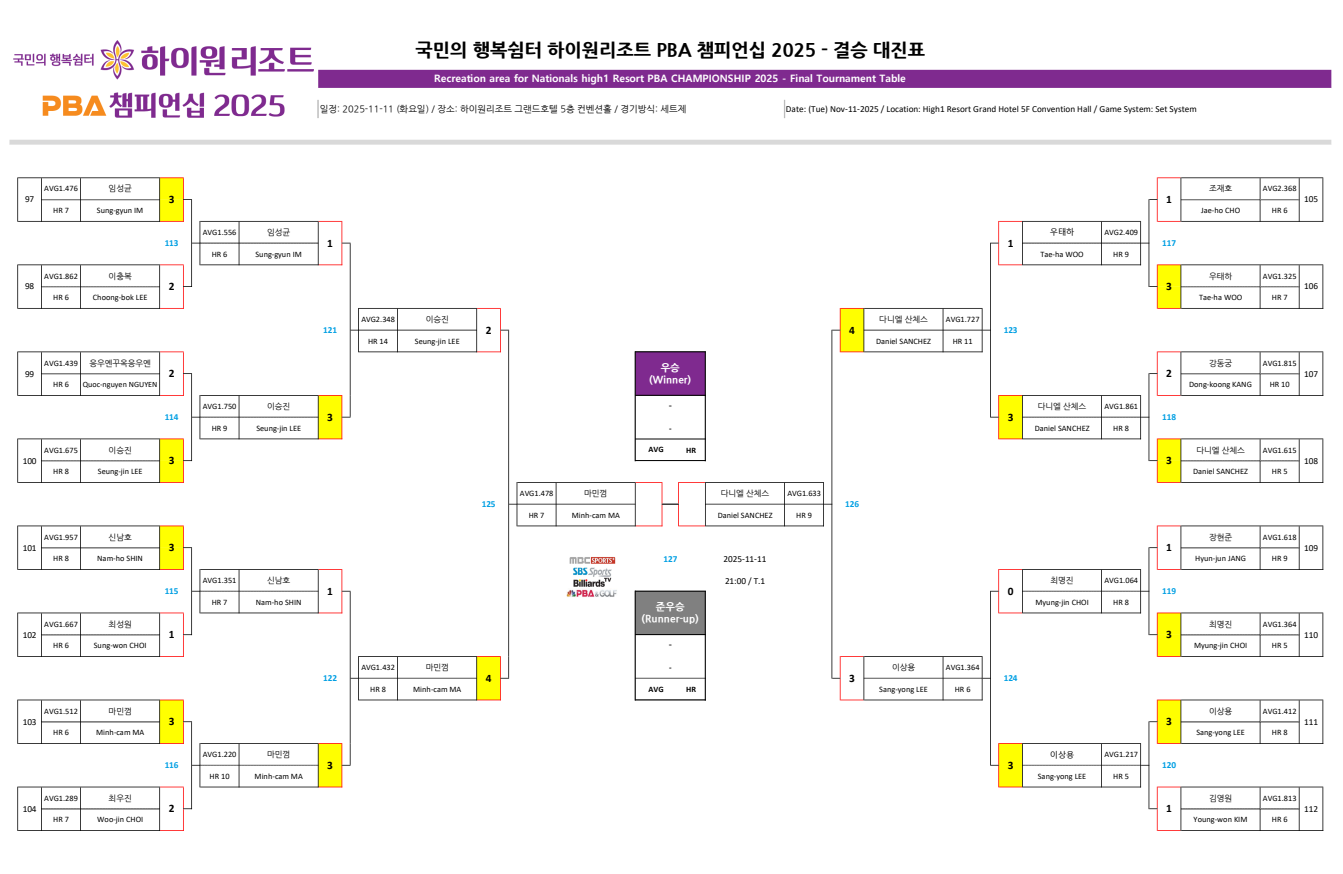 | 하이원리조트 PBA 챔피언십 2025 - 결승 대진표 (산체스 vs 마민껌) (0) | 2025.11.11 |