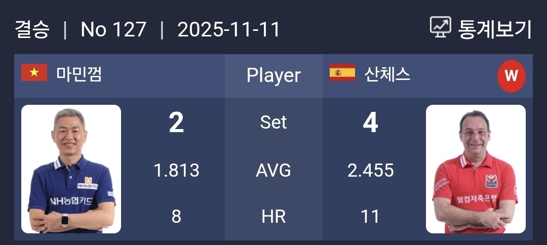 결승전 경기 결과는 산체스의 4–2 승리로 마무리되었고, 세트 평균 2.455와 하이런 11점이라는 강력한 수치로 우승 트로피를 들어 올렸습니다. 마민껌은 평균 1.813, 하이런 8점으로 마지막까지 끈질기게 추격했지만 흐름을 끝내 되돌리지는 못했습니다.