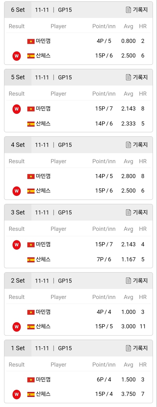 4세트는 결승의 분수령이었습니다. 마민껌이 폭발적인 단타 연결로 14점을 5이닝에 쌓아 올렸지만, 산체스가 특유의 루틴을 지키며 흔들리지 않고 다시 15점을 완주해 리드를 지켰습니다. 5세트에서 마민껌이 재차 한 세트를 따라붙어 마지막 희망을 살렸으나, 6세트에선 산체스가 초구부터 날카로운 시스템 공략으로 포지션을 열어젖히며 15점을 6이닝에 마무리해 승부에 마침표를 찍었습니다.