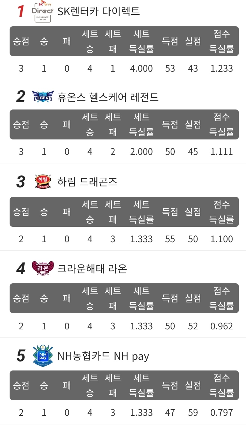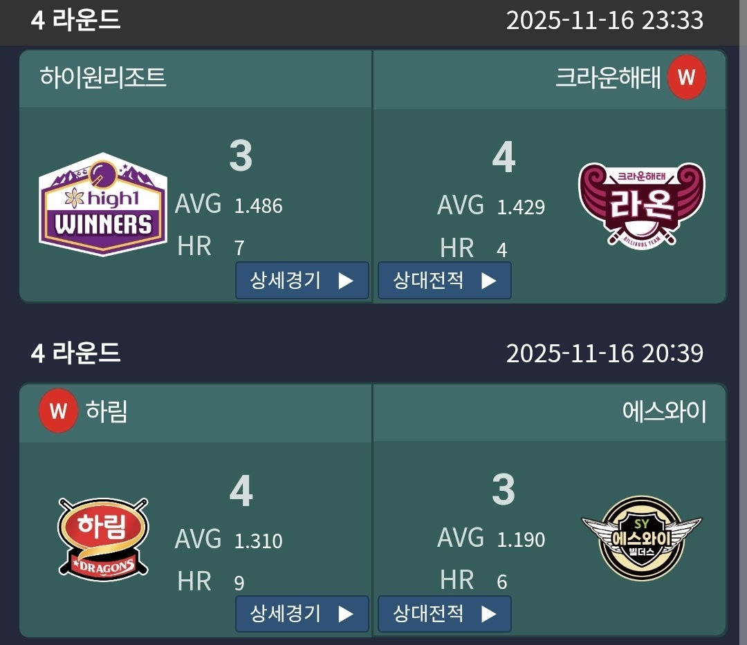 상위권 도약을 노리는 팀들의 승부도 치열했습니다. NH농협카드 NH pay는 하나카드 하나페이를 상대로 4대 3 승리를 거두며 기분 좋은 출발을 알렸습니다. 하나카드는 팀 평균 에버리지 1.686, 하이런 8점으로 내용상 밀리지 않는 경기를 펼쳤지만, 마지막 세트에서 NH농협카드의 뒷심을 막지 못하고 승리를 내주고 말았습니다. 정규리그 전체 순위에서 1위를 달리고 있는 하나카드로서는 아쉬운 패배였지만, 여전히 시즌 전체로 보면 가장 안정적인 전력을 유지하고 있으며 앞으로 남은 4라운드 경기에서 반등을 노릴 수 있습니다. 한편 하림 드래곤즈는 에스와이 빌더스를 상대로 4대 3 승리를 거두며 4라운드 3위에 올랐습니다. 팀 평균 에버리지는 하림이 1.310, 에스와이가 1.190으로, 양 팀 모두 공격과 수비가 잘 어우러진 접전을 펼쳤습니다만, 결정적인 순간에 한 큐를 더 성공시킨 쪽이 하림이었습니다.