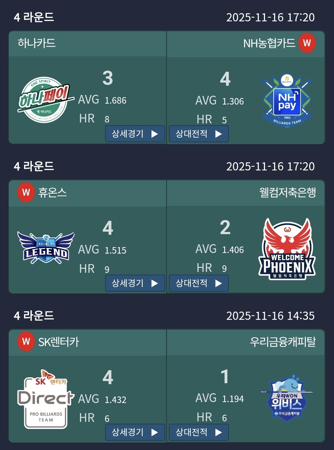 | PBA 팀리그 4라운드 1일차 – SK렌터카 다이렉트 vs 우리금융캐피탈 당구팀 경기결과 (2025-26) (0) | 2025.11.17 |
