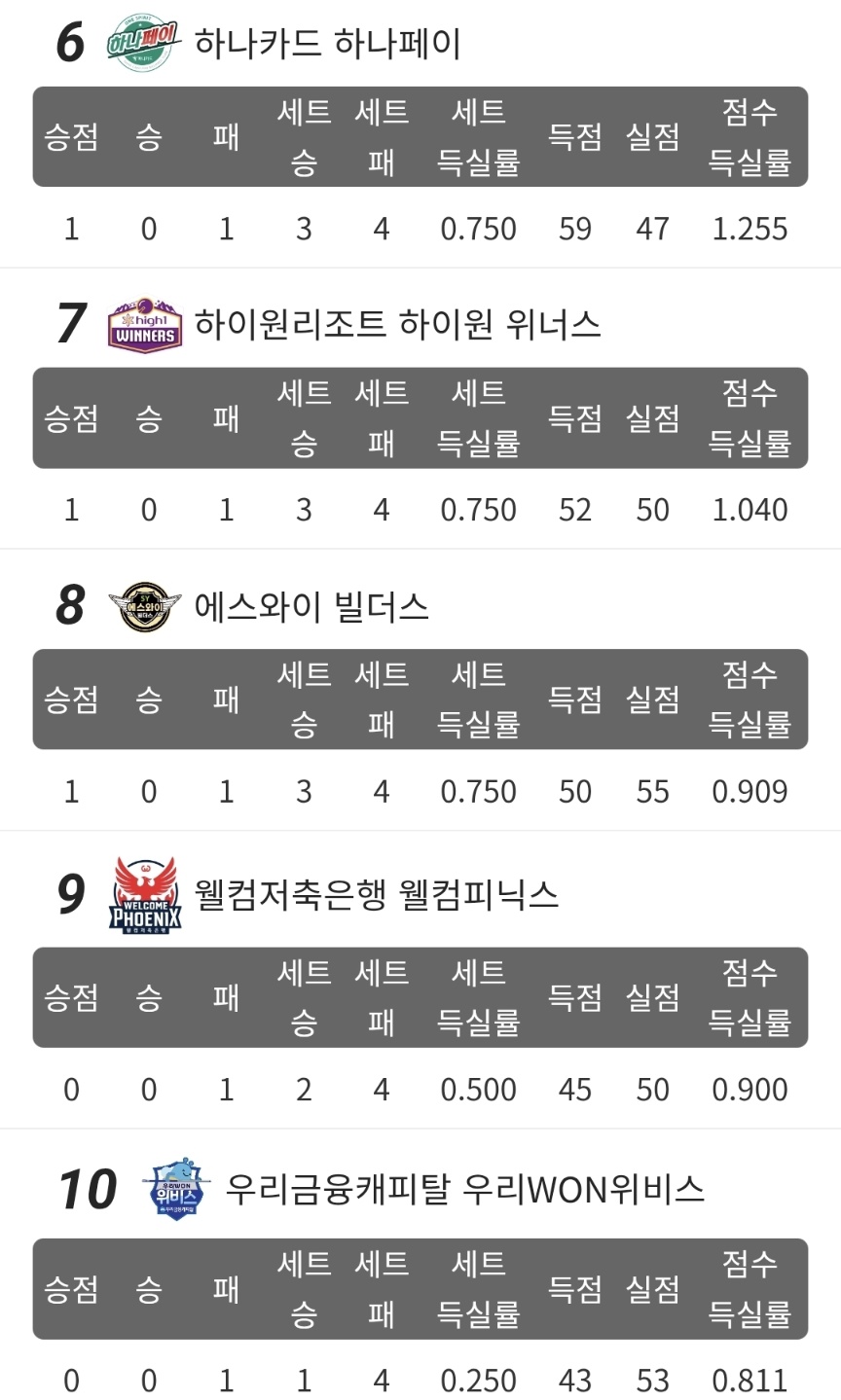 1일차 모든 경기가 끝난 현재 4라운드 팀 순위를 살펴보면 SK렌터카가 승점 3점으로 선두를 달리고 있고, 휴온스가 근소한 차이로 2위를 기록하고 있습니다. 그 뒤를 하림 드래곤즈, 크라운해태 라온, NH농협카드가 비슷한 승점과 세트 득실을 기록하며 촘촘하게 뒤쫓고 있습니다. 하이원리조트와 하나카드, 에스와이, 웰컴저축은행, 우리금융캐피탈은 아직 4라운드 초반인 만큼 한두 경기 결과에 따라 순위가 크게 바뀔 수 있는 구도입니다. 특히 정규리그 전체 순위 1위인 하나카드와 10위 크라운해태의 희비가 4라운드에서는 정반대 양상으로 나타나고 있어, 라운드가 진행될수록 순위표가 어떻게 재편될지 관심이 모이고 있습니다.