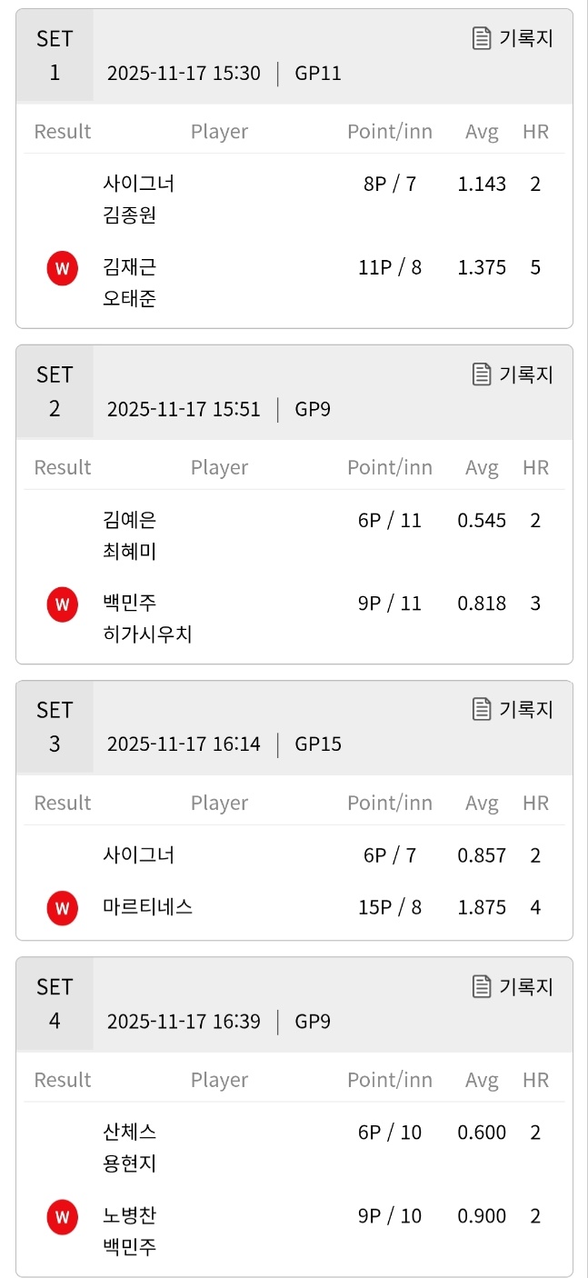 1세트 남자 복식에서는 웰컴저축은행의 사이그너–김종원 조와 크라운해태의 김재근–오태준 조가 맞붙었습니다. 사이그너 조가 7이닝 동안 8점을 올리며 나쁘지 않은 흐름을 보였지만, 김재근–오태준 조가 후반 집중력을 발휘하며 11대 8로 역전에 성공했습니다. 김재근 선수는 중요한 순간마다 하이런 5점을 이끌어 내며 주장다운 존재감을 보여주었습니다.