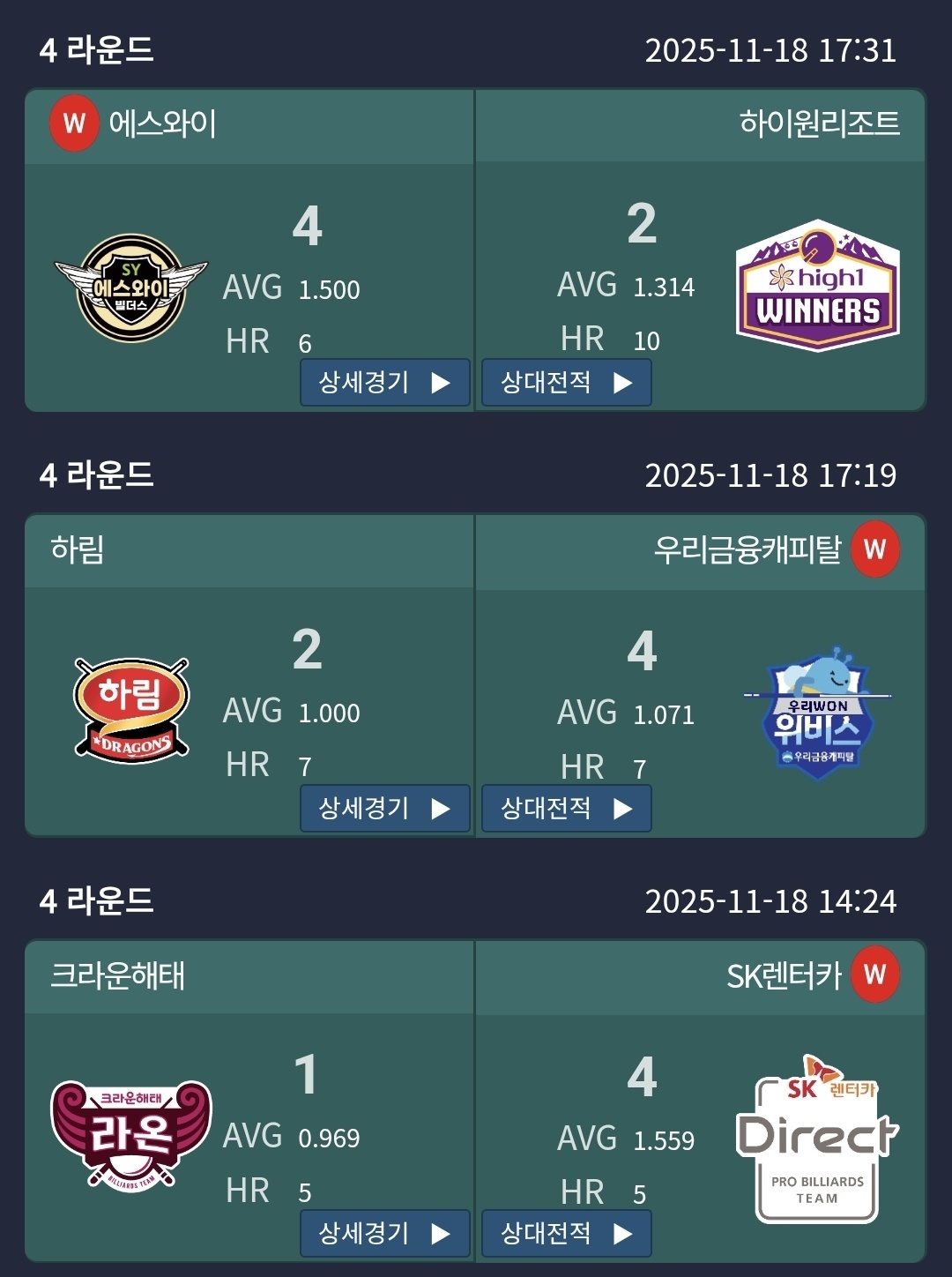 | PBA 팀리그 4라운드 2일차 경기결과 및 팀 순위 정리 (프로당구 2025-26) (0) | 2025.11.18 |