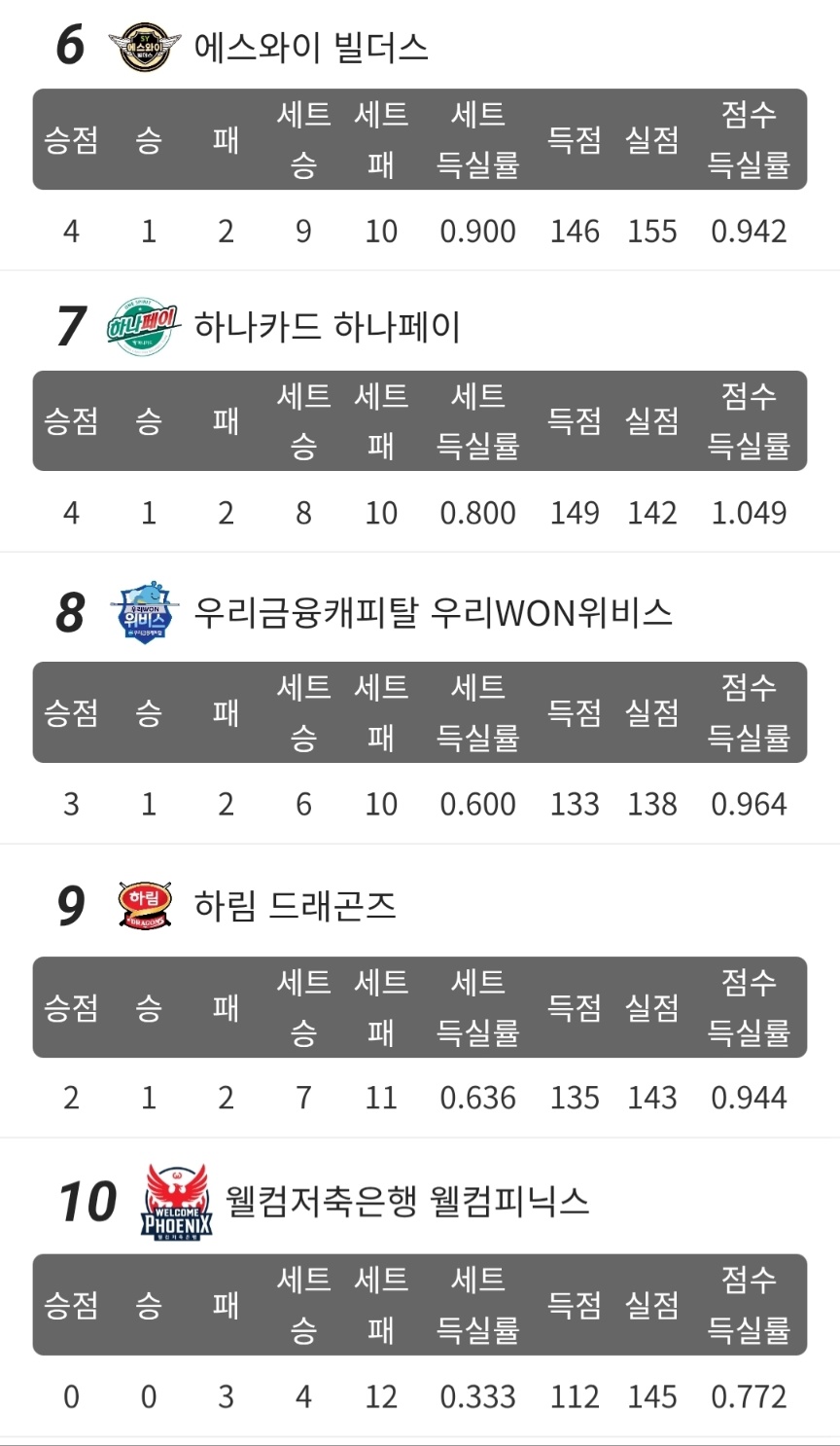에스와이 빌더스는 이날 승리로 4위로 올라섰고, 하이원리조트 하이원 위너스는 근소한 점수 차로 5위를 지켰습니다. 중위권에서는 NH농협카드와 하나카드가 나란히 6위, 7위에 자리했으며, 하림 드래곤즈가 8위로 올라섰습니다. 우리금융캐피탈은 9위, 웰컴저축은행은 10위에 머물며 어려운 흐름을 이어가고 있습니다.
