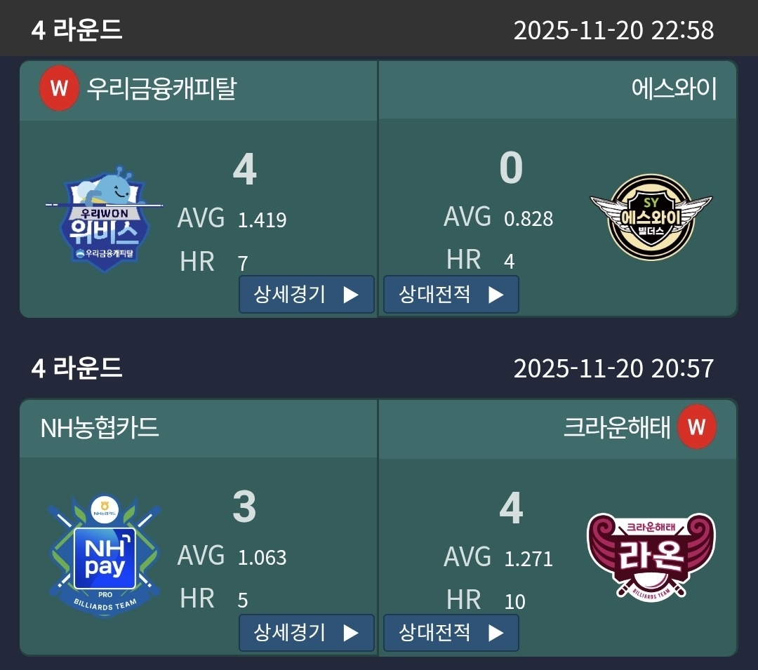 | PBA팀리그 4라운드 4일차 경기결과와 팀 순위 (프로당구 2025-26 시즌) (0) | 2025.11.20 |