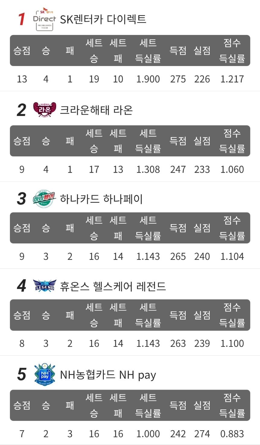 4라운드 5일차가 끝난 현재 라운드 순위는 그야말로 매일 엎치락뒤치락하는 양상입니다. 특히 상위권 두 팀은 4승 1패로 승패는 동일하지만 승점과 세트 득실 차이에 따라 순위가 갈리고 있습니다. SK렌터카와 크라운해태가 나란히 선두 경쟁을 펼치고 있고, 하나카드와 휴온스, NH농협카드가 그 뒤를 바짝 추격하는 구도입니다.