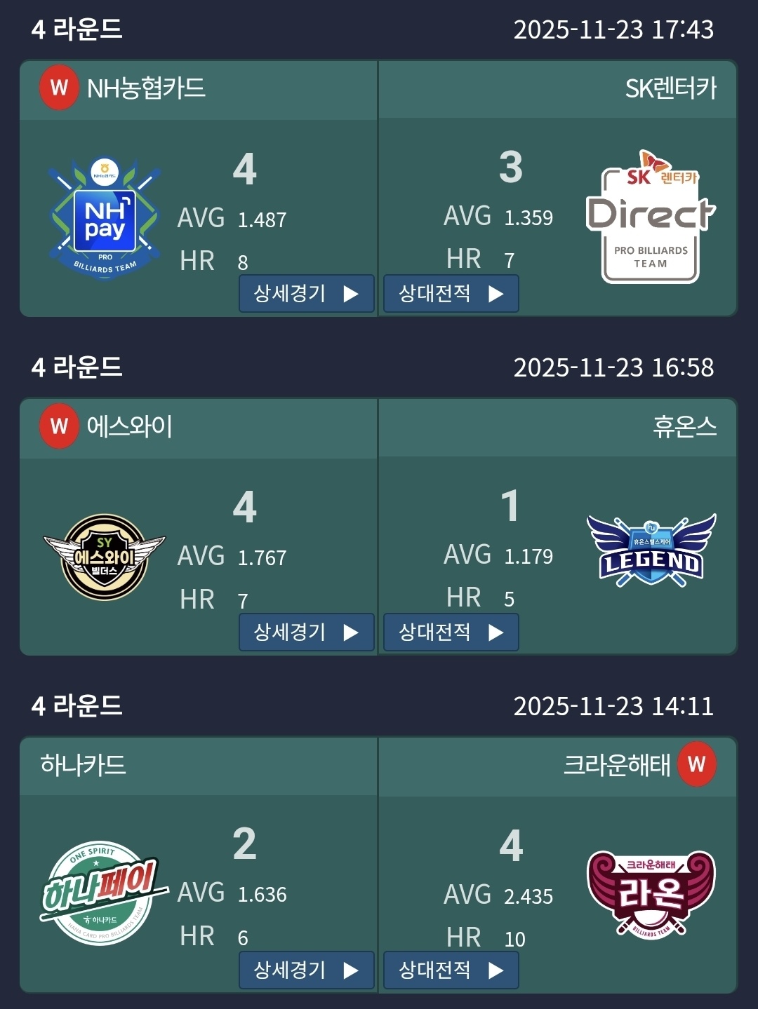 11월 23일에는 PBA 팀리그 4라운드 8일차 경기가 치러지며 상위권 판도가 크게 흔들렸습니다. 특히 1위 경쟁 중인 크라운해태 라온과 하나카드 하나페이, 그리고 상단권 순위를 노리는 SK렌터카, NH농협카드, 에스와이 빌더스, 휴온스 등 여러 팀이 승패를 가르며 4라운드 우승 향방이 더욱 긴장감 있게 전개되었습니다.