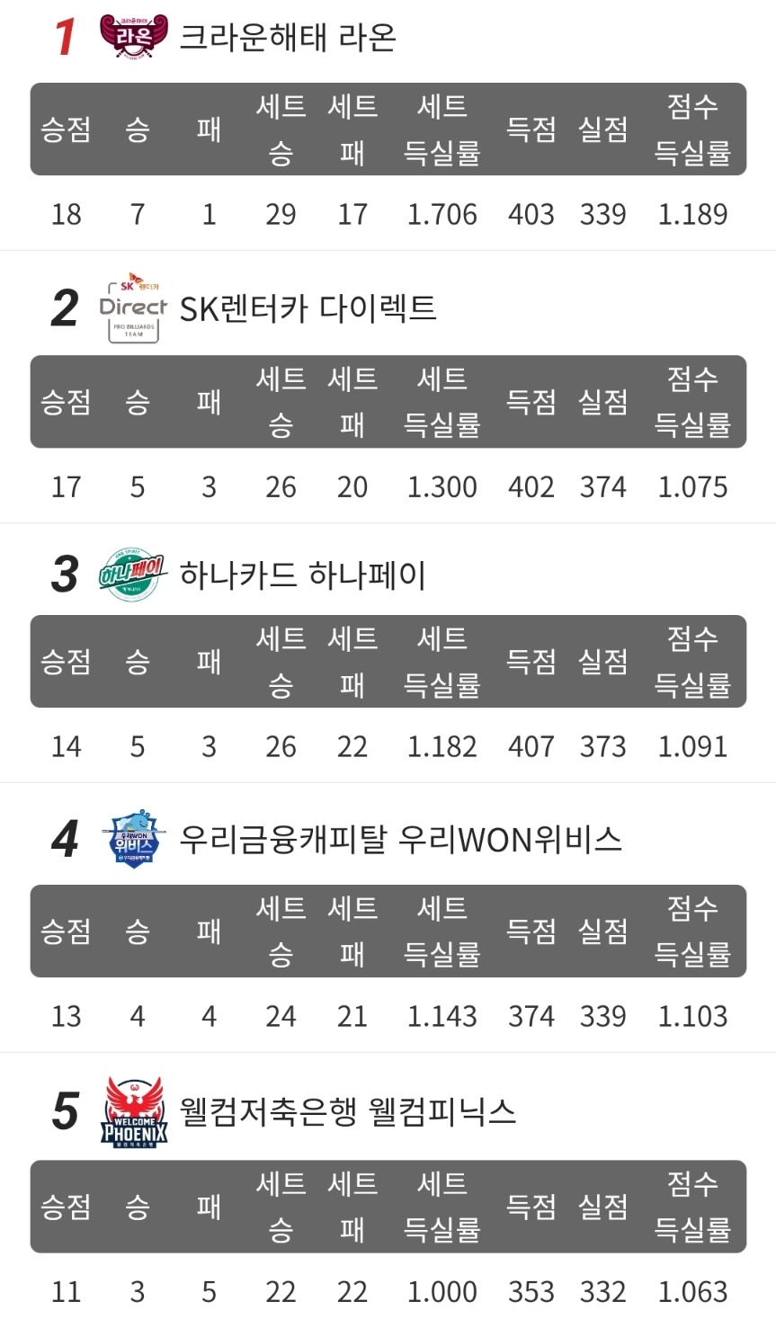 3위는 하나카드 하나페이가 14승점으로 자리하고 있으며, 우리금융캐피탈은 13승점으로 4위, 웰컴저축은행은 11승점으로 5위를 기록했습니다. 중위권에서는 하이원리조트, 휴온스, 에스와이 빌더스가 치열한 순위 다툼을 이어가고 있으며, 9위는 NH농협카드, 10위는 하림 당구팀이 차지하고 있습니다.