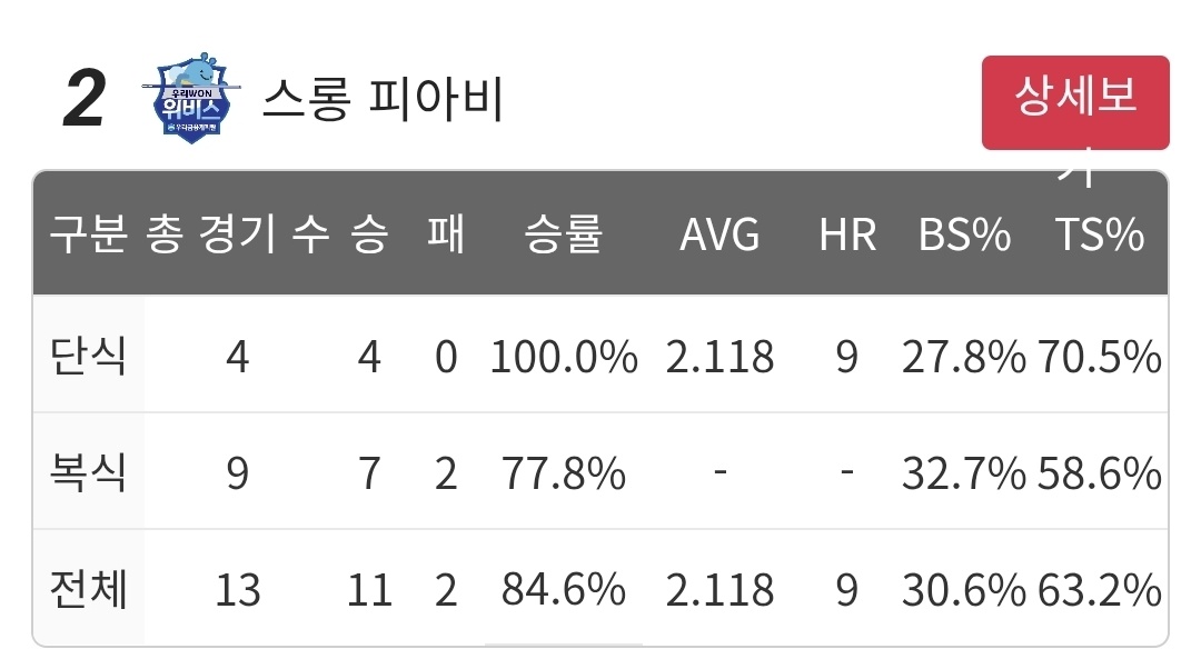 승률 2위는 우리금융캐피탈 우리WON위비스의 스롱 피아비 선수입니다. 총 13경기를 치러 11승 2패, 승률 84.6%를 기록하며 그야말로 팀의 에이스다운 면모를 여실히 보여 주었습니다. 단식에서는 4경기 모두 승리해 100% 승률을 기록했고, AVG 2.118, HR 9점, BS% 27.8%, TS% 70.5%라는 탄탄한 지표를 남겼습니다. 기회가 주어질 때마다 단식에서 확실하게 승리를 가져오며 팀 분위기를 끌어올린 것이 특징입니다. 스롱 피아비는 랭킹 1이 김가영과는 상금과 랭킹 포인트에서 큰 차이가 있지만, 여전히 독보적인 랭킹 2위를 기록하고 있습니다.