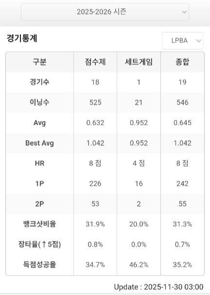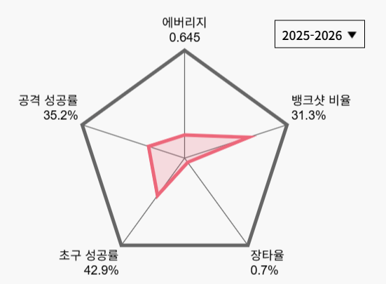 2025-2026 시즌의 전체 평균 에버리지는 0.645로, 안정적인 득점 페이스를 유지하고 있습니다. 득점제 경기에서는 평균 0.632, 세트 경기에서는 0.952의 에버리지를 기록하고 있어, 단판제보다는 세트 경기에서 더 강한 모습을 보여 준 적도 있습니다. 시즌 최고 에버리지는 1.042로, 완전히 흐름을 탄 경기에서는 폭발적인 공격력을 발휘할 수 있다는 것을 보여 줍니다.