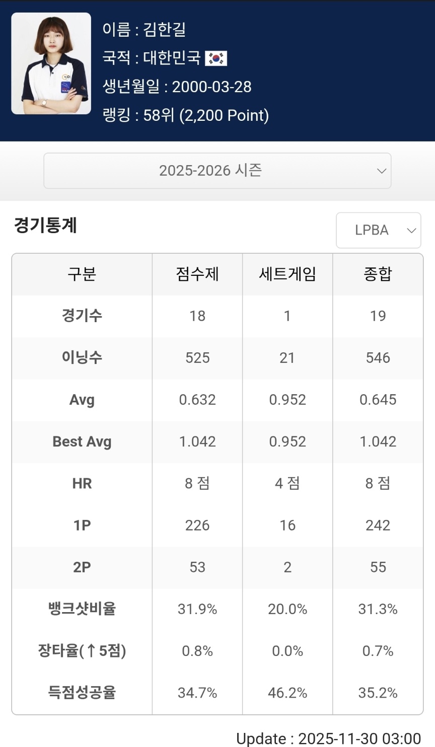 김한길 선수의 생년월일은 2000년 3월 28일이며, 2025년 기준 만 25세입니다. LPBA 투어에서 20대 선수는 상대적으로 많지 않기 때문에, 김한길 선수는 젊은 에너지와 성장 가능성을 겸비한 대표적인 차세대 선수라고 볼 수 있습니다. 국적은 대한민국이며, 차분하고 침착한 경기 운영이 특징입니다. 64강 경기에서 보여준 집중력은 나이에 비해 상당히 성숙한 경기력을 갖추고 있다는 점을 입증했습니다.