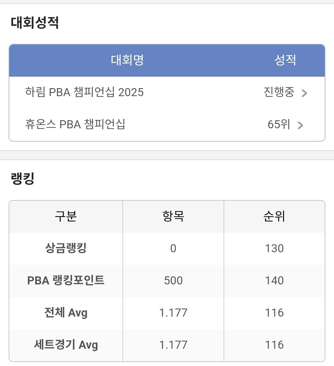 현재 이희진 선수의 PBA 공식 랭킹은 140위이며, 랭킹포인트는 500점, 상금 랭킹은 130위로 집계되고 있습니다. 아직 투어 경험은 적지만, 세트 경기 평균 1.177, 전체 평균 1.177을 기록하며 안정적인 득점 감각을 보여주고 있습니다. 시즌 성적은 많지 않지만, 휴온스 챔피언십에서 65위에 오른 이후 꾸준히 경기 적응력을 끌어올리는 모습이 보이고 있습니다.