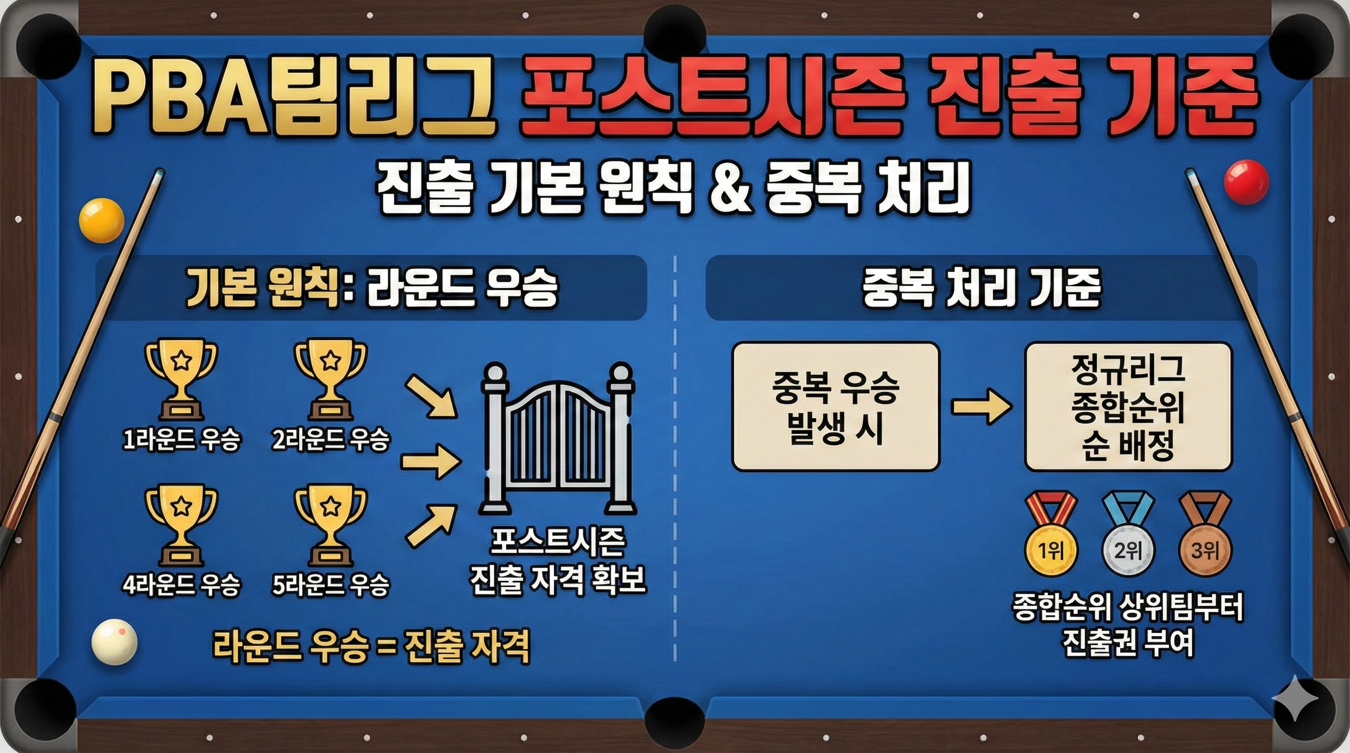 이 글은 웰컴저축은행 PBA 팀리그에서 어떤 팀이 포스트시즌에 진출하는지를 공식 대회요강 기준으로 정리한 안내 글입니다. 정규리그 5개 라운드 운영 방식부터 라운드 우승팀 선정 원칙, 우승팀 중복 시 처리 기준, 그리고 정규리그 종합순위에 따라 결정되는 포스트시즌 대진 구조까지 차분하게 설명드립니다.