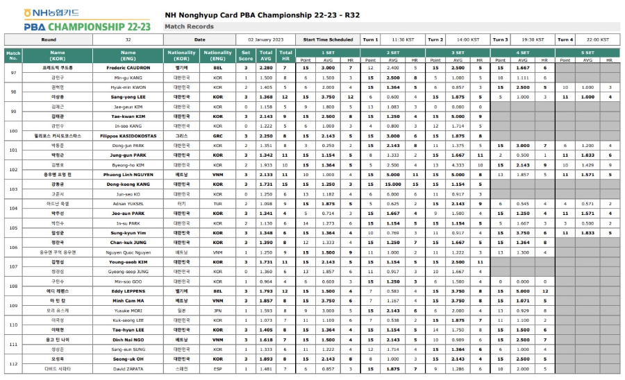 NH농협카드 PBA 챔피언십 22-23 16강 대진표 - 32강 경기결과