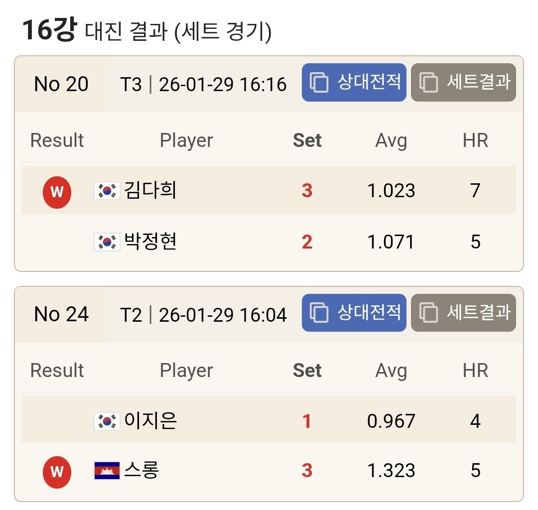 16강 1턴 경기 결과, 김가영, 백민주, 김다희, 스롱 피아비 선수가 8강 진출을 먼저 확정했습니다. 다만 아직 모든 8강 대진이 완성된 것은 아니며, 남은 16강 2턴 경기 결과에 따라 최종 대진표가 완성될 예정입니다.