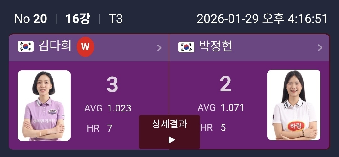 | 웰컴저축은행 LPBA 챔피언십 32강 2일차 1턴 결과 정리 (0) | 2026.01.28 |
