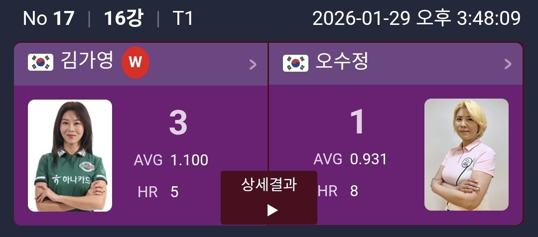 가장 먼저 열린 경기에서는 김가영 선수가 오수정 선수를 세트 스코어 3대1로 꺾고 8강 진출을 확정했습니다. 김가영 선수는 경기 내내 안정적인 흐름을 유지하며 중요한 순간마다 점수를 놓치지 않는 모습을 보여줬습니다. 큰 흔들림 없이 자신의 리듬을 지켜낸 점이 인상적이었습니다.