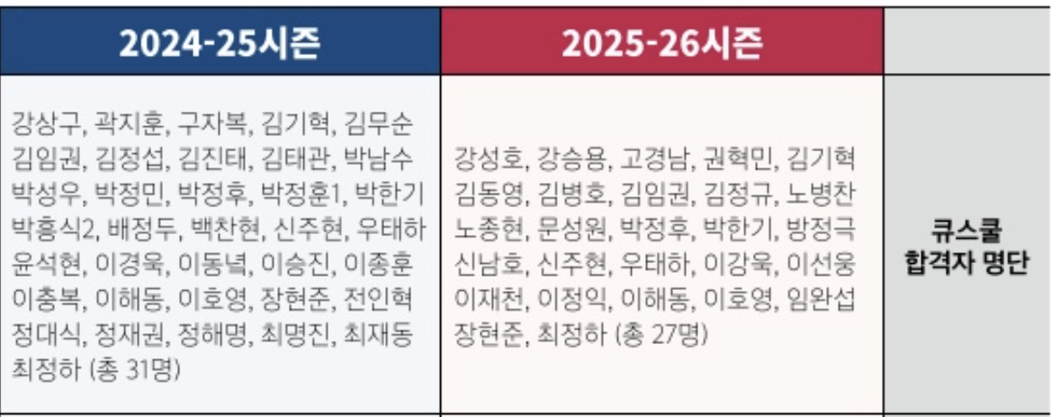 2022~2023시즌 역시 강동구, 강성호, 구민수, 김민건, 노종현, 마원희, 박준영, 서삼일, 이승진, 최재동, 최준호, 한동우 등 총 31명이 Q스쿨을 통과하며 다시 무대로 돌아왔습니다.