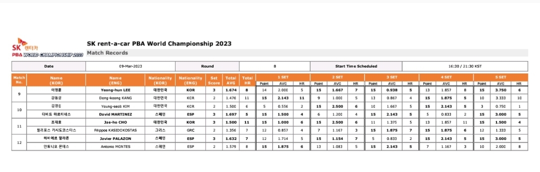 | SK렌터카 PBA 월드 챔피언십 2023 결승 대진표 4강 경기결과 (0) | 2023.03.11 |