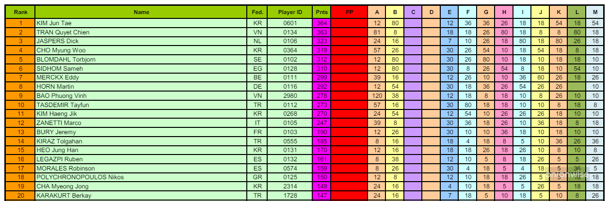 세계 남자 당구 선수 랭킹 전체 자료는 UMB가 공지한 위의 자료를 참고바랍니다. PDF 36장으로 구성되어 있으며 랭킹 3,258위까지의 정보를 담고 있습니다.