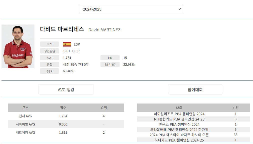 - 다비드 마르티네스의 프로당 PBA투어 경기지표 종합 페이지