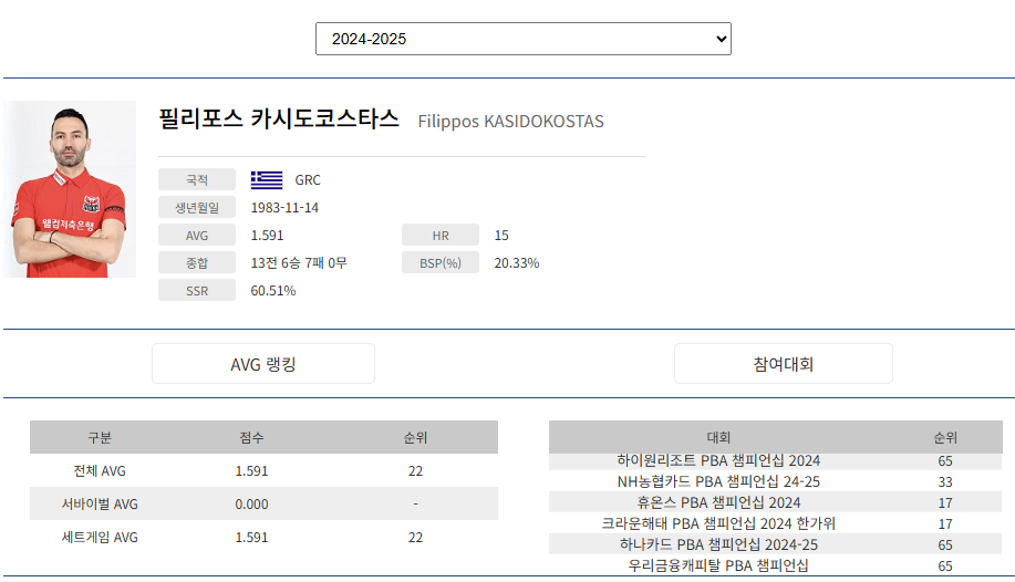 *출처 : PBA 프로당구협회 선수정보 참고 : 경기지표는 시즌이 종료된 이후에 최종 업데이트됩니다.