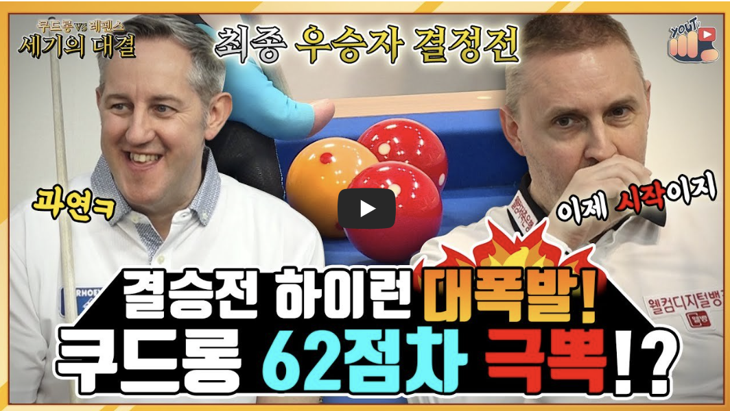 "프로당구선수에게 세리를 금지시켜야 하는 이유가 바로 이런것이네요. 쿠드롱 에디레펜스 선수 두 분 다 너무 좋아하는 선수들인데 이런 명경기를 보여주셔서 너무 감사드립니다."