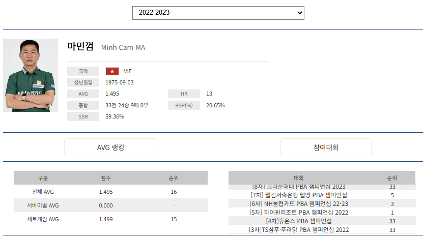 들어가기전에 우선 베트남 당구선수 마민껌의 이름은 프로당구 출범 초기에는 한 동안 마민캄으로 표기되었습니다. 그러다 언제 부터인가 마민껌으로 표기를 바꾸면서 혼란이 발생하고 있습니다. 이곳에서는 초기부터 사용된 마민캄으로 사용하겠습니다. 이 페이지는 PBA 프로당구협회가 주관/주최하는 남자 프로당구대회, PBA 투어에 출전하고 있는 마민캄의 PBA투어 경기 3쿠션 에버리지, 하이런, 상금 랭킹, 선수 순위, 뱅크샷 득점비율 BSP(%), 종합전적 등 당구 지표를 총정리하는 마민캄 당구 데이터베이스입니다.