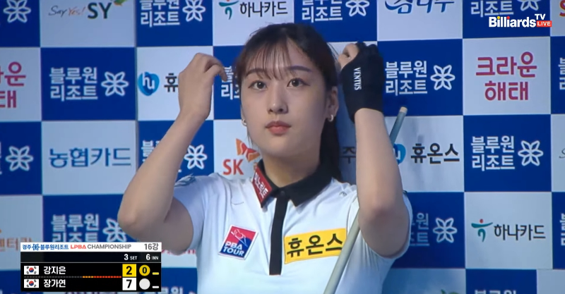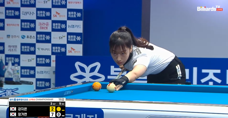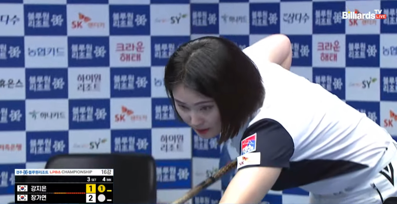 6월 15일 저녁에 있었던 경주 블루원리조트 LPBA챔피언십 16강전, 장가연 당구선수와 강지은 당구선수의 경기 장면 사진을 감상하고 가겠습니다.