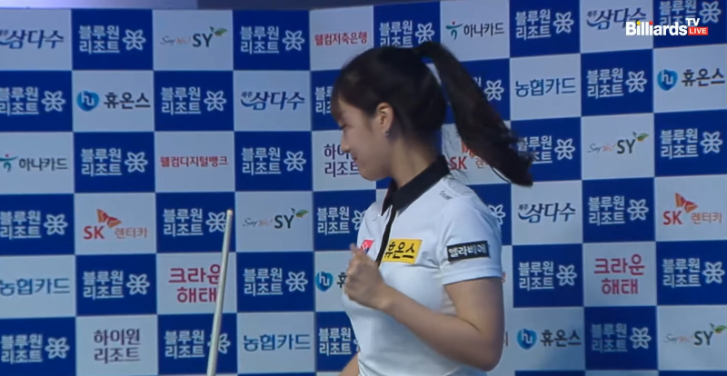 승리가 확정되는 순간, 장가연 당구선수는 두 주먹을 불끈 쥐었습니다.