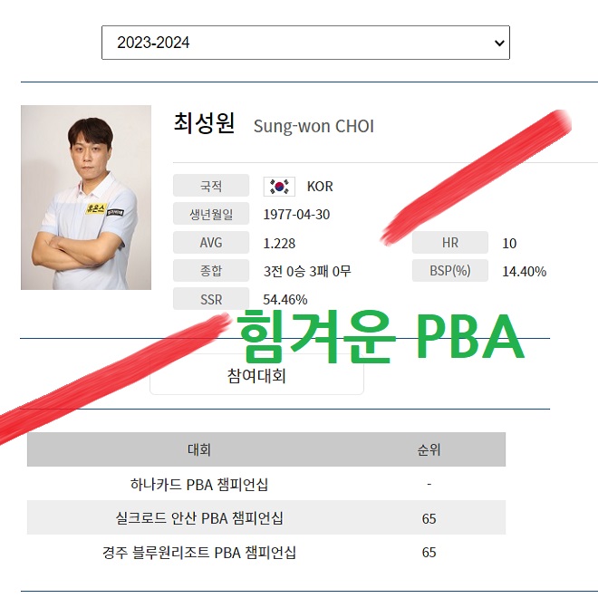 최성원 선수는 올시즌 PBA 투어 1차 대회에서 부터 2차, 3차 대회까지 3연속으로 128강 첫 경기에서 탈락하였습니다. 한 때 UBM 주관 세계 3쿠션 선수권자에 올랐던 최성원 당구 선수의 시련은 도대체 언제까지 계속될지요? 생각보다 길어지고 있습니다.