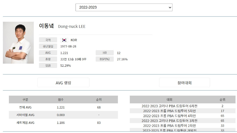 이동녘 당구 선수의 PBA 투어 경기 종합 전적 승률 정보입니다. 추후 업데이트 예정입니다.