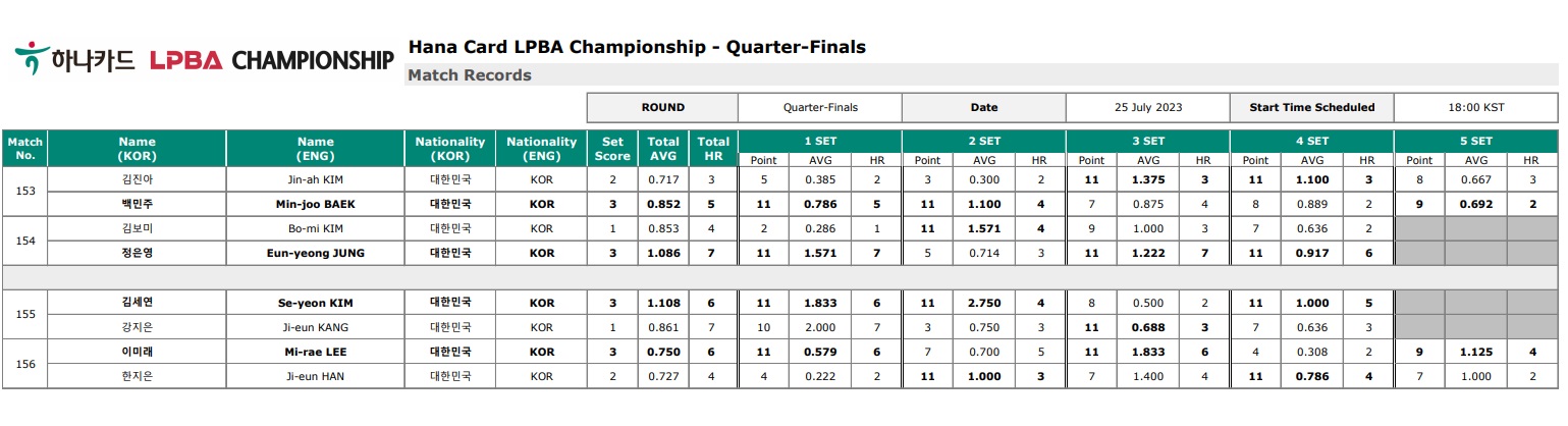 1. 하나카드 LPBA 챔피언십 8강 경기결과