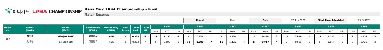 2023년 7월 27일 늦은 밤에 끝난 펼쳐진 프로당구 23-24시즌 3차대회, 하나카드 LPBA 챔피언십 결승전 경기결과입니다. 우승은 백민주, 준우승은 김세연으로 결정되었습니다. 이로써 백민주는 LPBA 첫우승의 꿈을 이루었습니다.