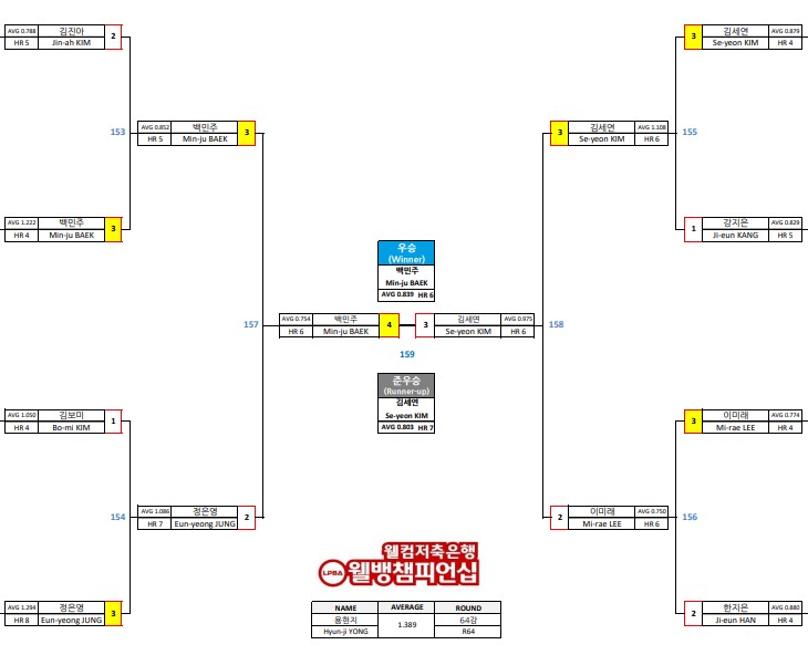결승전 경기결과, 게임 에버리지는 백민주 0.839, 김세연 0.803을 기록하였습니다. 한편 이번 대회 최고 에버리지를 기록한 선수에게 주어지는 이번 대회 웰뱅톱랭킹은 용현지 당구 선수가 64강에서 1.389를 기록하며 수상했습니다. LPBA 퍼펙트큐 수상자(상금 1천만원)는 나오지 않았습니다.