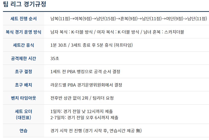 PBA 팀리그의 세트간 휴식시간은 1분 30초이며, 3세트 종료 후 5분 휴식 (하프타임)을 가지며, 공격제한 시간은 35초입니다. PBA 팀리그 초구 결정은 1세트 전 PBA 뱅킹으로 공격 순서를 결정하며, 초구 배치는 라운드별 PBA 경기운영위원회에서 결정하여 공지합니다.